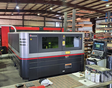 Our Amada fiber laser can cut up to 3/4” steel, 3/8” stainless, and 3/8” aluminum. The laser features auto-nozzle changing and auto-shuttling tables that allow unattended operation with minimal down time.